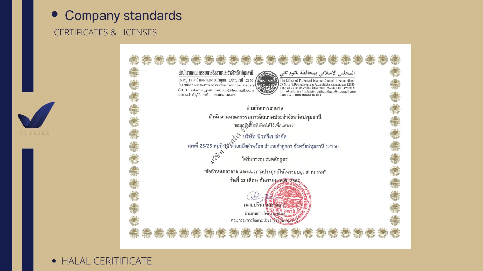 มาตรฐานด้านความปลอดภัยทางอาหาร สุขลักษณะที่ดี มีมาตรฐาน ทั้งกระบวนการผลิต สถานที่ ทำเลที่ตั้ง อุปกรณ์ ตลอดจนการขนส่ง จะต้องมีการปกป้องและไม่มีการปนเปื้อนลงสู่อาหาร บริษัท นิวทรีเร จำกัด ได้รับรองระบบจาก GMP อัพเกรดเป็น GHPs สู่อีกขั้นของมาตรฐานการผลิตอาหารเสริม