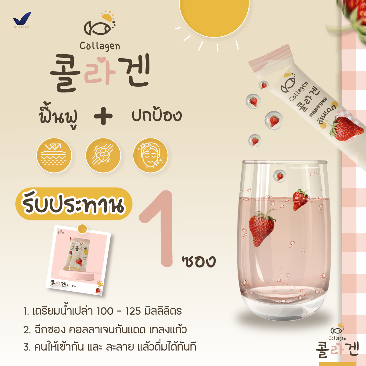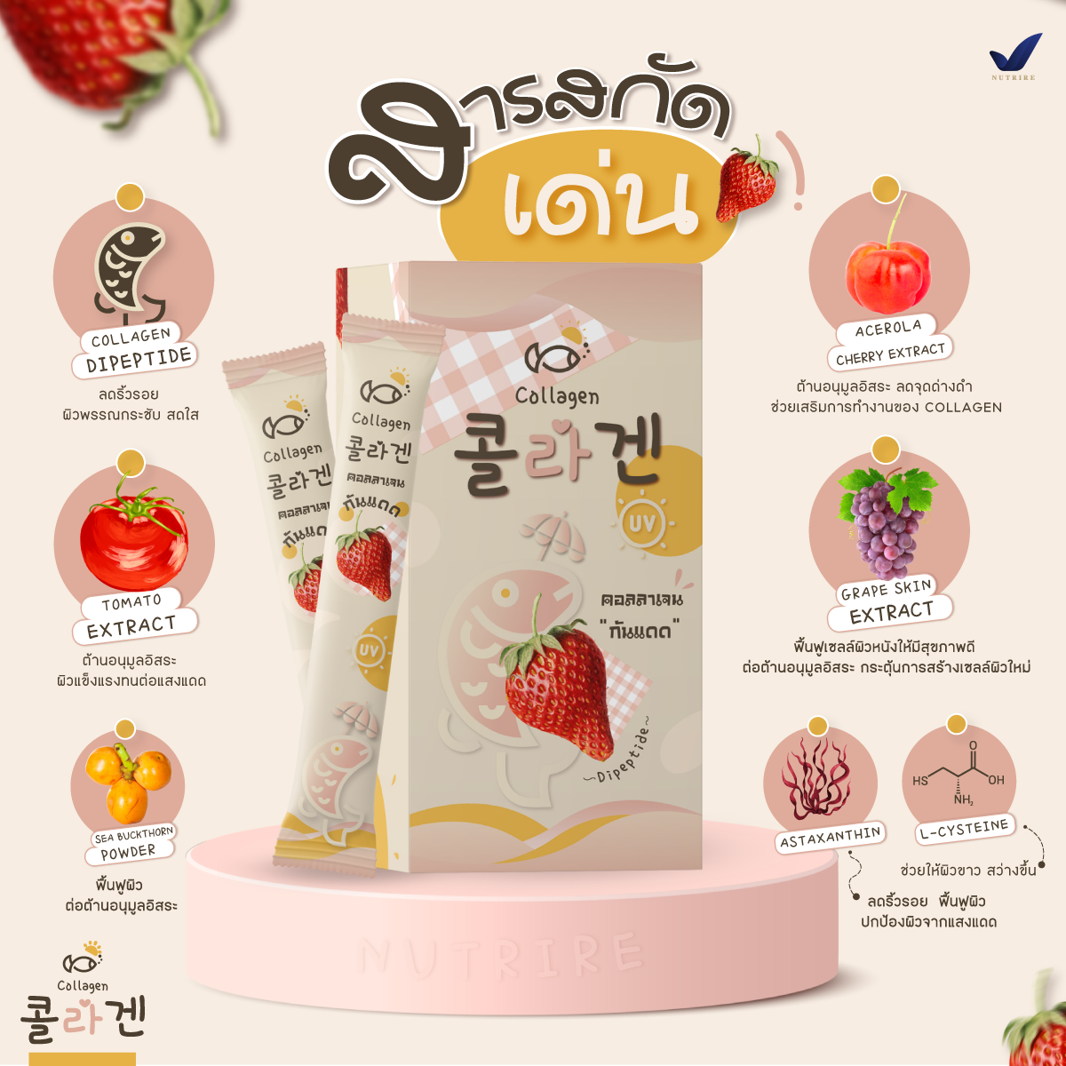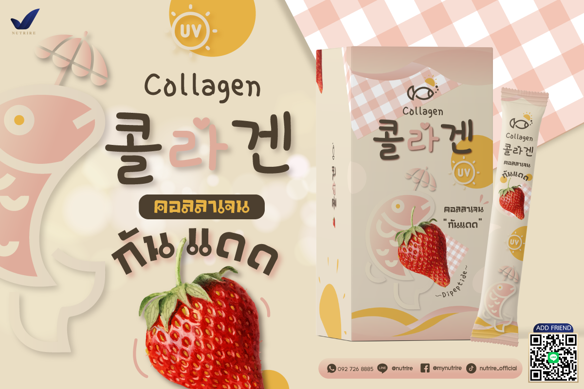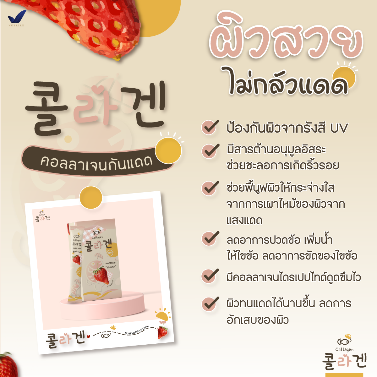 ผลิตภัณฑ์เสริมอาหาร คอลลาเจนกันแดด กลิ่นสตรอเบอร์รี่ รูปแบบผง ช่วยฟื้นฟูผิวให้กระจ่างใสจากการเผาไหม้ของผิวจากแสงแดด และ เป็นสูตรที่ช่วยปกป้องผิวให้แข็งแรงจากแสงแดด แสงยูวี