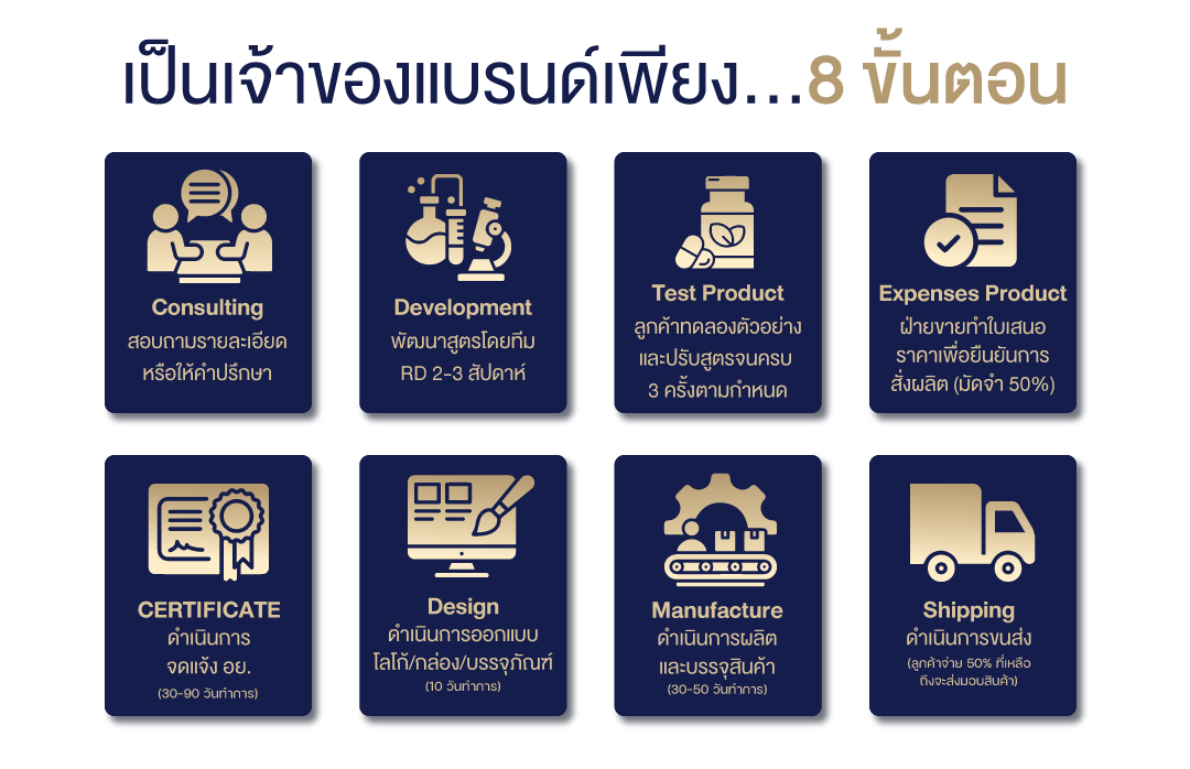 เรามีทีมนักวิจัยที่เชี่ยวชาญ เภสัชกร โภชนาการและ อาหารเสริม ประสบการณ์มากกว่า 20 ปี พร้อมห้องปฏิบัติการ (Laboratory) และ เครื่องมือปฏิบัติการที่ทันสมัย สามารถพัฒนาสูตรใหม่ ๆ ตามความต้องการของลูกค้าได้อย่างรวดเร็ว และที่สำคัญเป็นสูตรที่มีเอกลักษณ์เฉพาะแบรนด์ของลูกค้า